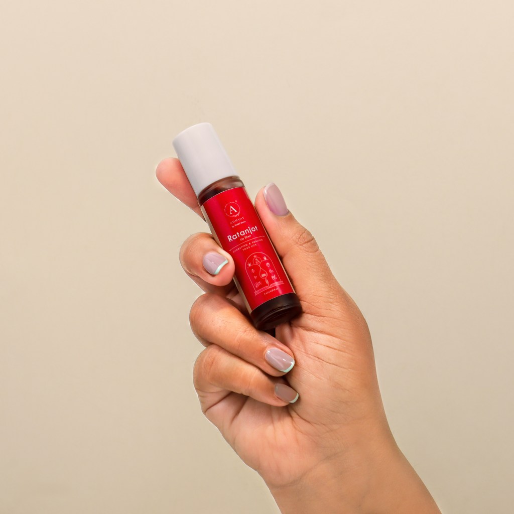 - Apply Ratanjot Lip Elixir – This hydrating and healing lip oil keeps lips moisturized, plump, and serves as a nourishing primer. It helps improve the wear of liquid and matte lipsticks, preventing them from settling into cracks.